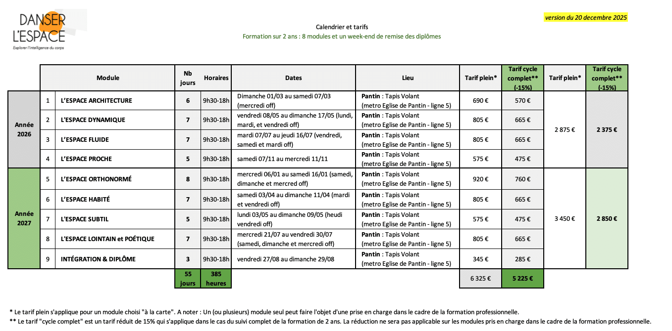 Pour obtenir la certification DANSER L'ESPACE vous devez suivre la totalité de ce cursus de 8 stages ainsi que les 3 jours complémentaires de clôture.
